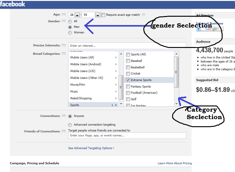 According Facebook advertising strategy, advertisers can targeted their ads to most ideal peoples by choosing location,age,gender,interest,workspace, etc. Actually Facebook offered advertisers to target those people who will be interested for their ads. For example- If an advertiser have a product like cowboy boots, then he could target those people who will be interested to buy their boots. see the picture bellow..